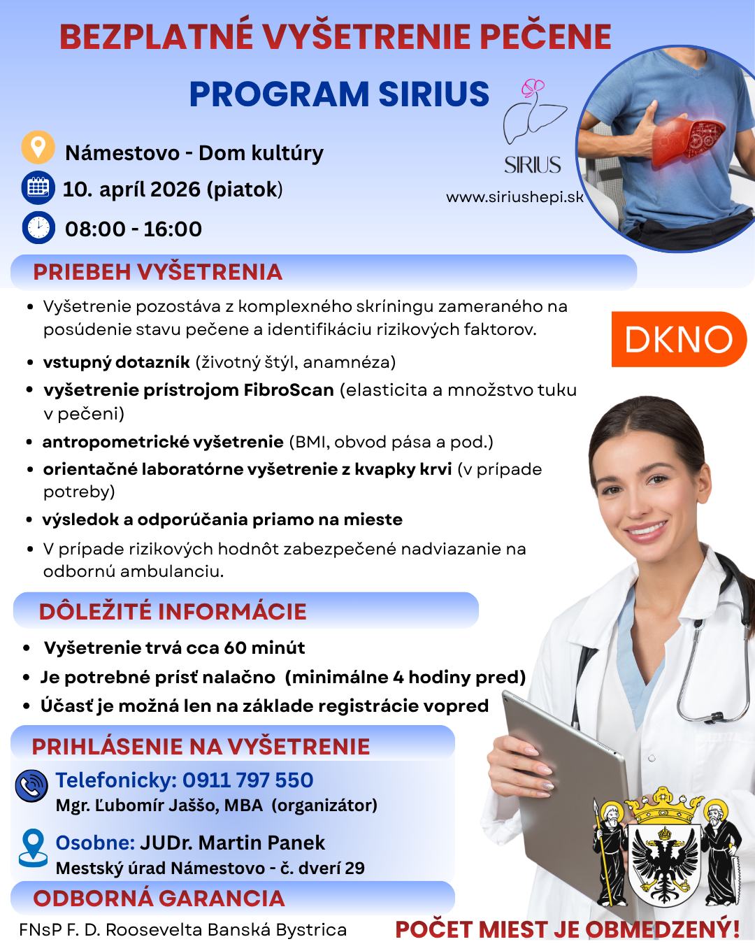 Mesto Námestovo v spolupráci s odborným tímom programu SIRIUS, poslancom MsZ Ľubomírom Jaššom a Domom kultúry Námestovo prináša obyvateľom možnosť absolvovať bezplatné preventívne vyšetrenie pečene.